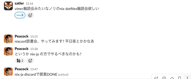 こちらの運営に興味のある方は是非nix-jaのDiscordなどで、私(@peacock0803sz)に声をかけてもらえたらと思います。